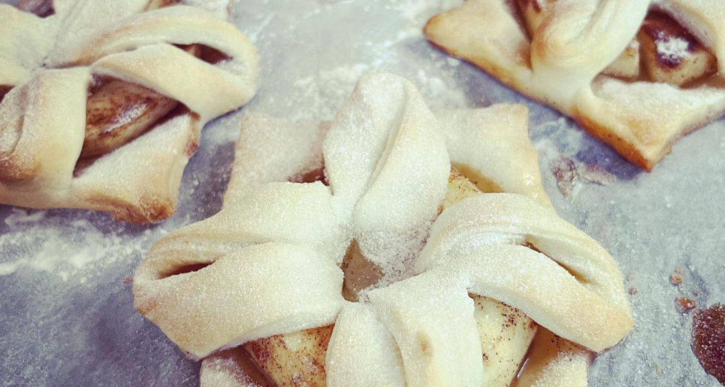 4 davon mit etwas Wasser bestreichen, die anderen Quadrate übereinander legen und auf ein mit Backpapier belegtes Backblech platzieren. Die Quadrate einschneiden (siehe Bild). Apfel schälen und in Ringe schneiden, der Kern ausstechen. Ringe im Honig wenden dann im Zucker-Zimt und mittig auf das Quadrat legen, die Ecken in das Apfelloch klappen und für 30 Minuten bei 180 Grad Umluft im Ofen backen.
