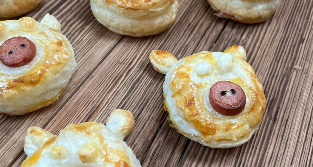 Blätterteig ausrollen, 18 große Kreise ausstechen, 9 davon mit Frischkäse bestreichen, mit den nicht bestrichenen Kreise zudecken. Weitere 9 kleinere Kreise ausstechen für das „Schnörli" und 18 gleiche für die Ohren. Wienerli in 9 Stücke schneiden, mit dem „Schnörlikreis" auf dem großen Kreis platzieren. Die Ohrenkreise in der Mitte zusammenklappen und oben am Kreis platzieren.