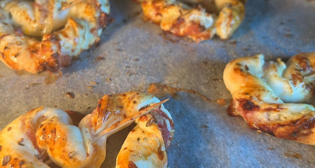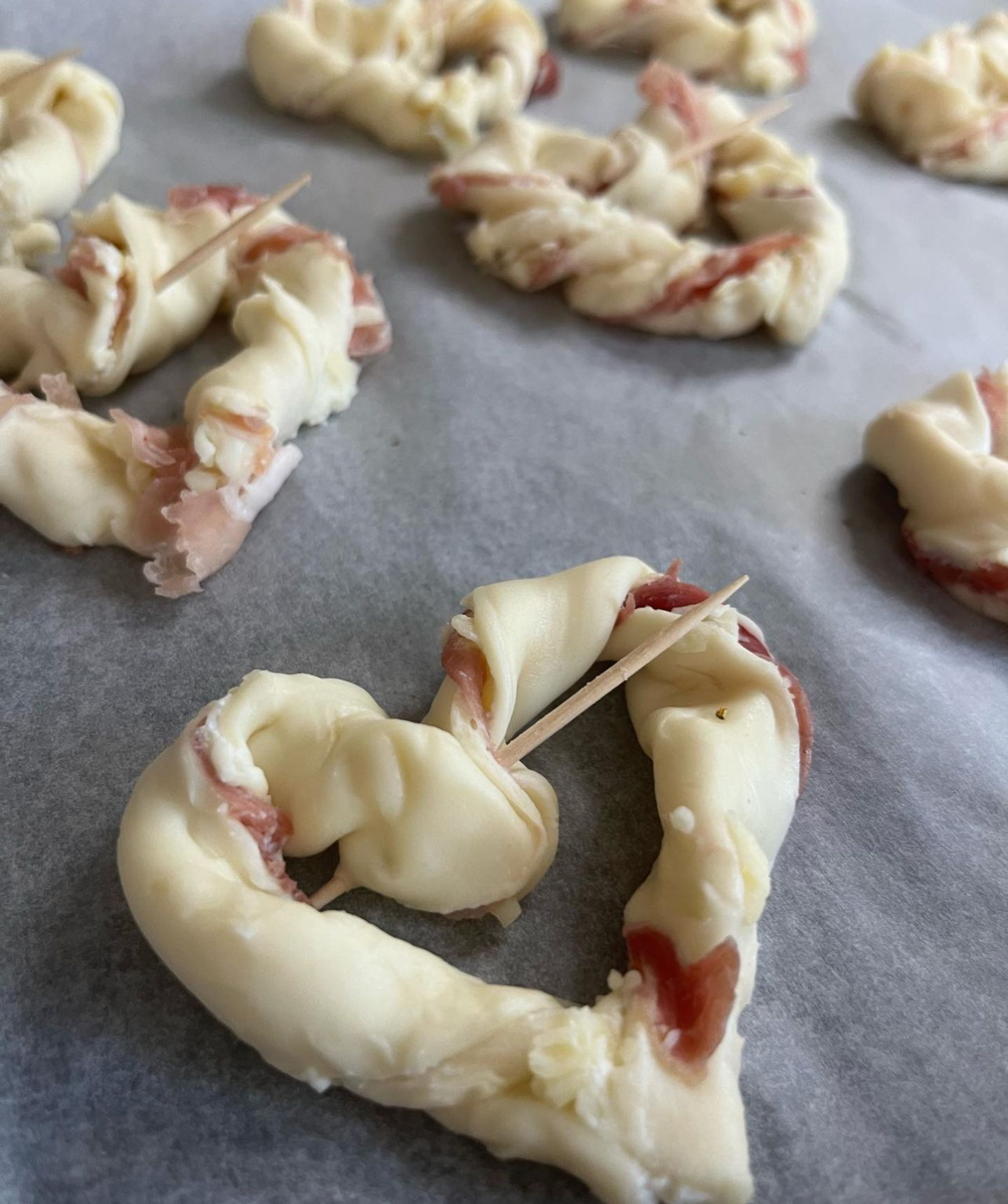Blätterteig mit Ricotta bestreichen. Den Bergkristall grob reiben und über den Ricotta streuen. Rohschinken auf die obere Hälfte verteilen und mit der unteren Hälfte zuklappen. 6 Stränge schneiden und halbieren. Die Stränge zwirbeln, die Enden verbinden und ein Herz formen. Auf ein mit Backpapier belegtes Blech verteilen mit dem verquirlten Ei bestreichen, Salz&Pfeffer, Leinsamen darüber streuen und für