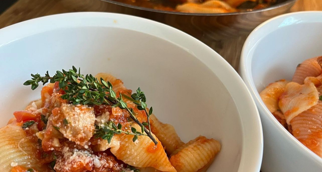 In einer Bratpfanne mit etwas Butter Würste, Knoblauch und Thymian anbraten. Karotten und Zitronensaft dazugeben, mit pelati ablöschen, Temperatur runterschalten. Petersilie,Chiliflocken und Honig untermischen.