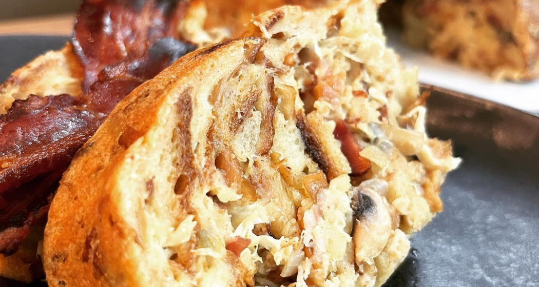 erhitzen. Zwiebeln, Speck und Pilze andünsten. Milch und Eier mit dem Brot mischen für 10 Minuten einwirken lassen. Sauerkraut ausdrücken und in die Schüssel geben, mit Salz&Pfeffer und Muskat würzen alles gut miteinander mischen.
