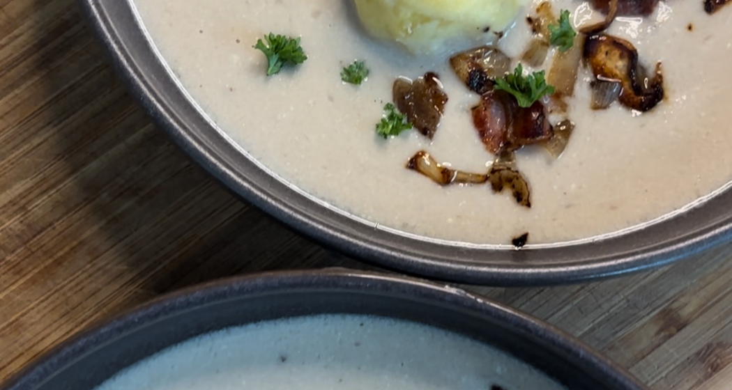 Zwiebel in Butter glasig dünsten, Champignons dazugeben und kurz anbraten. Mit Fleischbouillon und Süssmost ablöschen, 15 Minuten kocheln lassen.