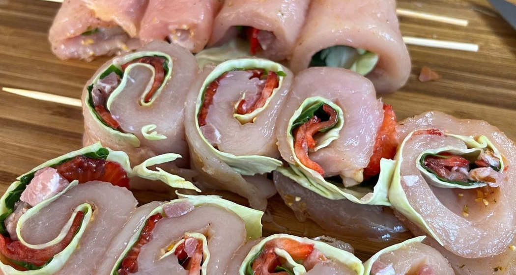 Die Hälften mit den Kabis-, Spinatblätter belegen. Die Erdbeeren dünn schneiden und verteilen. Paar Speckwürfel darüber und einrollen. Mit zwei Spiesse durchstechen und in der Mitte halbieren. Das Ei verquirlen würzen, die Spiesse darin wenden und mit dem Paniermehl, Maismischung panieren. Kurz in einer Bratpfanne beide Seiten anbraten. Alles im Ofen bei 180 Grad Umluft für