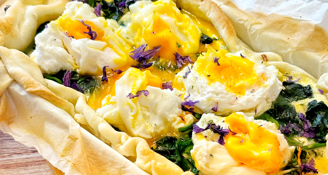 Flammkuchenteig mit Backpapier in die Backofenform geben. Zwiebeln und Knoblauch schälen, klein schneiden und zusammen mit dem Spinat wenig Bouillon in einer Pfanne andünsten und danach etwas abkühlen lassen. Magerquark mit einem rohen Ei vermengen gut mit Salz&Pfeffer abschmecken. Den Spinat mit der Quarkmasse und dem Käse vermengen und in den Teig geben. In den Backofen bei 200 Grad Ober-/ Unterhitze 15 Minuten backen. Wasser und Essig in einer Pfanne erhitzen, in leicht siedendes Wasser die Eier einzeln in den Wasserstrudel gleiten lassen ca. 4 Minuten ziehen lassen (verlorene Eier). Die Eier auf den Flammkuchen anrichten und servieren wer mag noch paar getrocknete Blüten darüber streuen und geniessen.