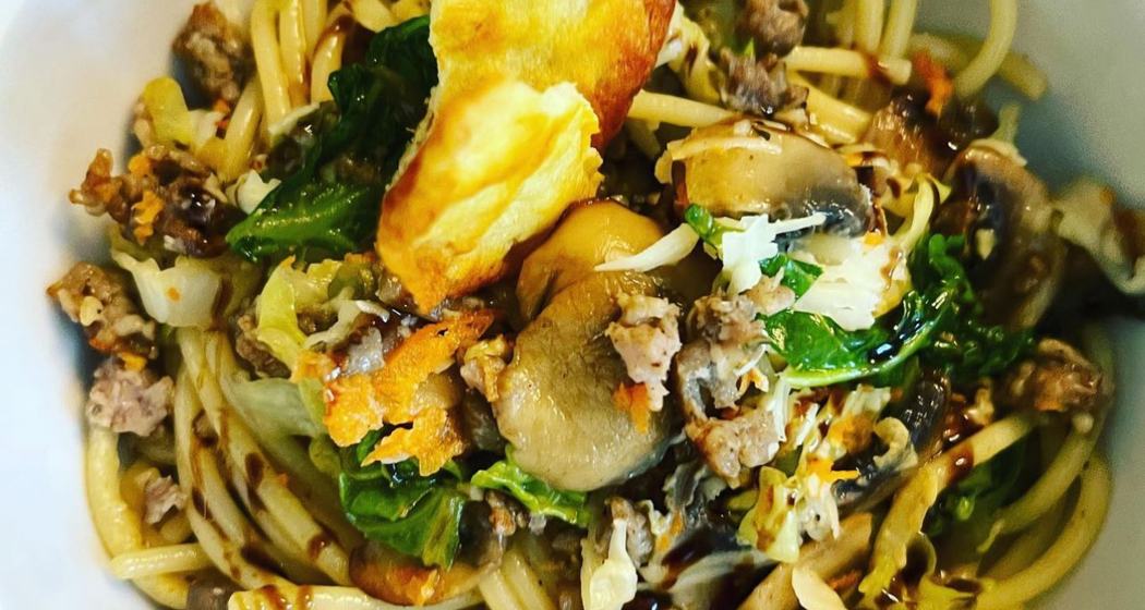 Die Spaghetti abgießen und in die Bratpfanne geben. Eier mit dem Mineralwasser verquirlen, mit Muskat und Salz&Pfeffer würzen. Die Eiermasse über die Spaghetti geben, leicht erwärmen und auf einem Teller anrichten etwas Reibkäse,geraffelte Karotten darüber streuen und servieren.