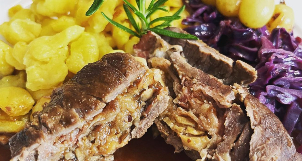 In der Bratpfanne das Fleisch kurz scharf anbraten. In ein Schmortopf geben,dazu habe ich meine Bartensauce gemacht Rezept findet ihr im Feed habe noch 2 Stückchen schwarze Schokolade dazugeben und alles im Schmortopf für 90Minuten bei 150Grad Umluft geschmort. Dazu Butterspätzli, Rotkabis und gebratene Trauben.