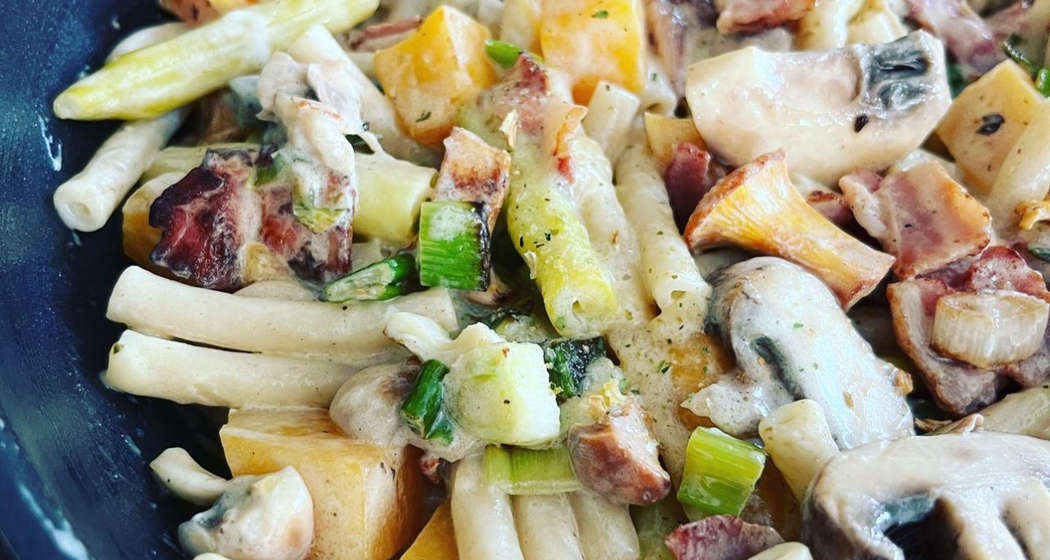 Magronen im Salzwasser al dente kochen. Kürbis, Bohnen, Zwiebel, Pilze waschen und schälen dann mit dem Speck klein schneiden. In einer Bratpfanne Speck und Zwiebeln anbraten die Pilze dazu und kurz mit anbraten beiseite stellen. Kürbis mit den Bohnen in der Bratpfanne mit Apfelsaft und dem Rahm gar kochen, kurz vor Schluss Crème fraîche unterrühren. Magronen, Speck und die Pilze zum Kürbis geben alles gut untereinander mischen der Käse dazu und mit Salz&Pfeffer abschmecken.