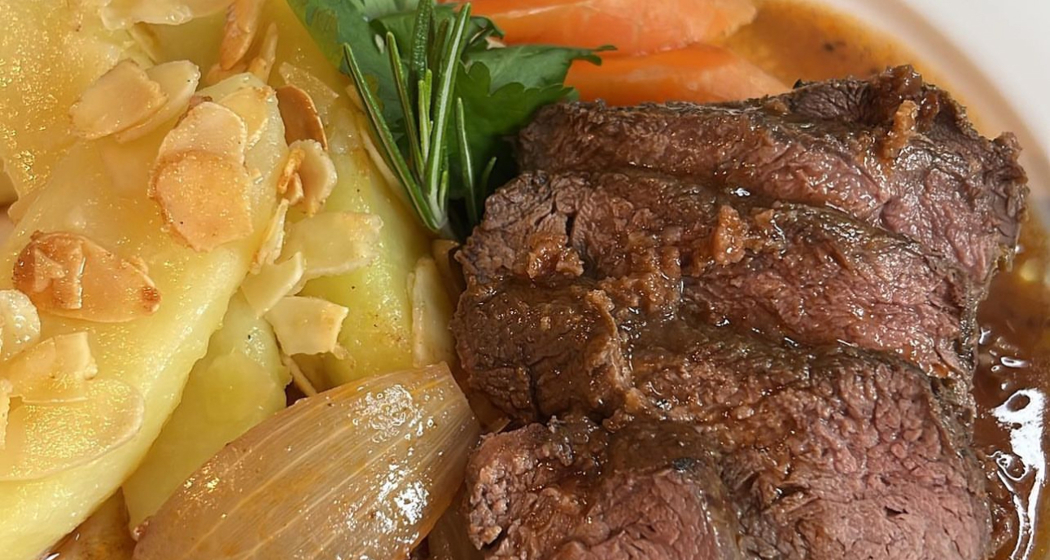 In der Bratpfanne Brotwürfel, Tomatenmark, Balsamico, Wein und Bouillon einkochen, abschmecken, danach zum Fleisch geben, 12 Minuten bei 180 Grad Umluft garen.