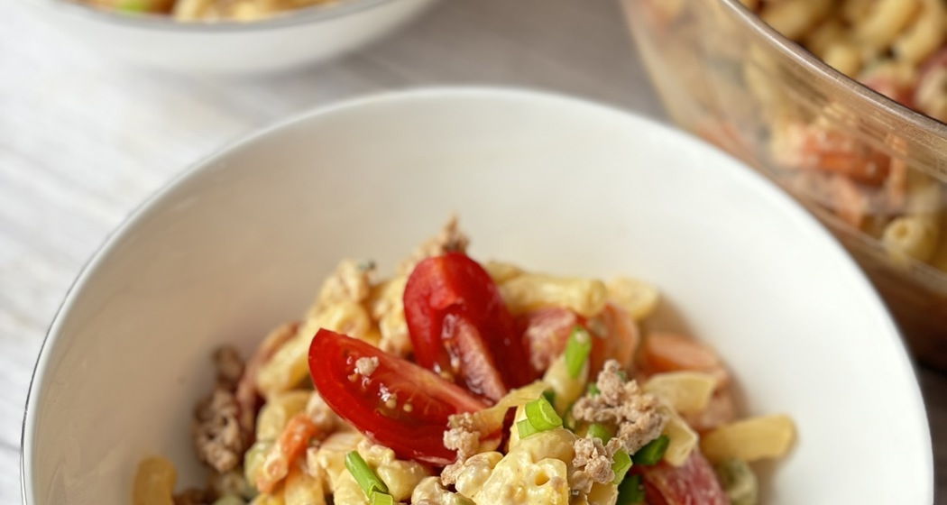 Karotten,Cherrytomaten, Erbsen und Eier zusammen mit dem Hackfleisch und den Hörnli in eine Schüssel geben.