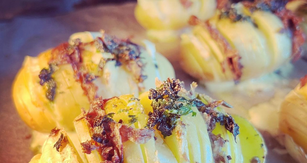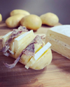 Kartoffeln roh Fächerförmig schneiden, mit Rapsöl beträufeln und würzen. Den Weichkäse in Scheiben schneiden vierteln und in die Spalten stecken. Das Siedfleisch halbieren und auch in die Zwischenräume des Fächers verteilen.