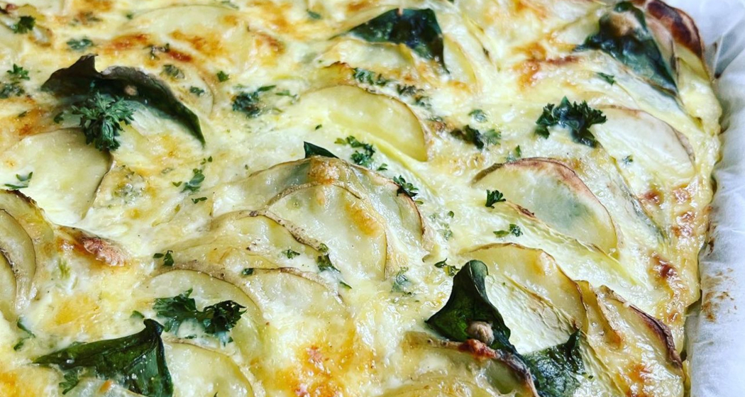 Für den Guss. zwei Eier mit Rahm verquirlen mit etwas Salz&Pfeffer würzen danach über die Kartoffeln verteilen, etwas Petersilie, Reibkäse darüber streuen und für 30 Minuten in den Ofen bei 180 Grad Umluft backen.