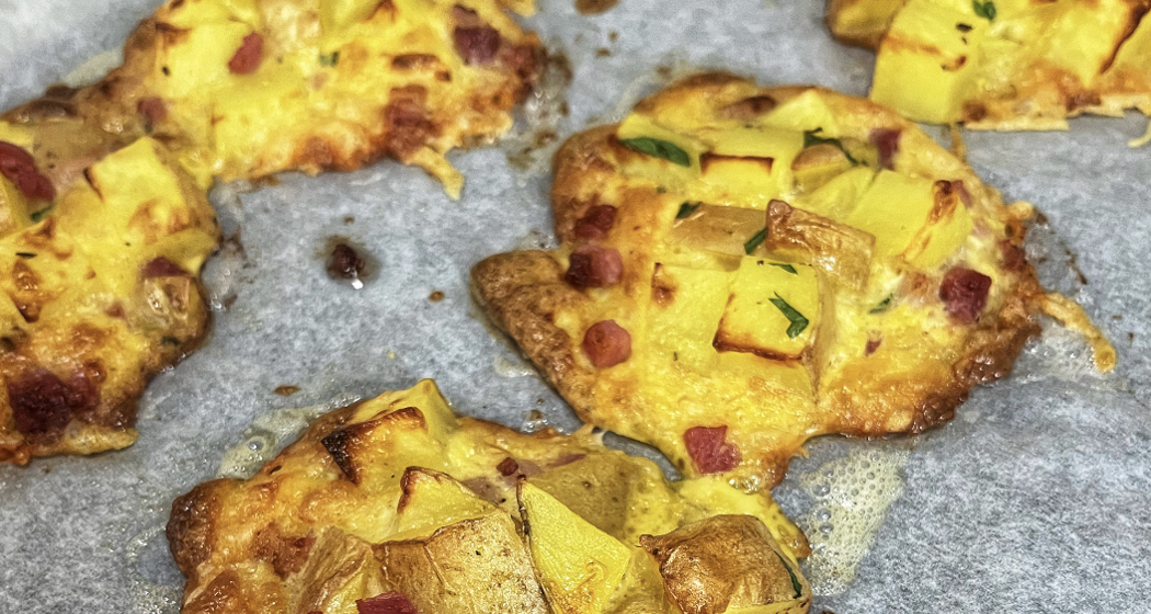 Eier zu dem Kartoffelwürfel geben, vermengen und auf die Käsekreise verteilen. Die Restflüssigkeit verteilen und für 15 Minuten, bei 200Grad,Umluft backen.