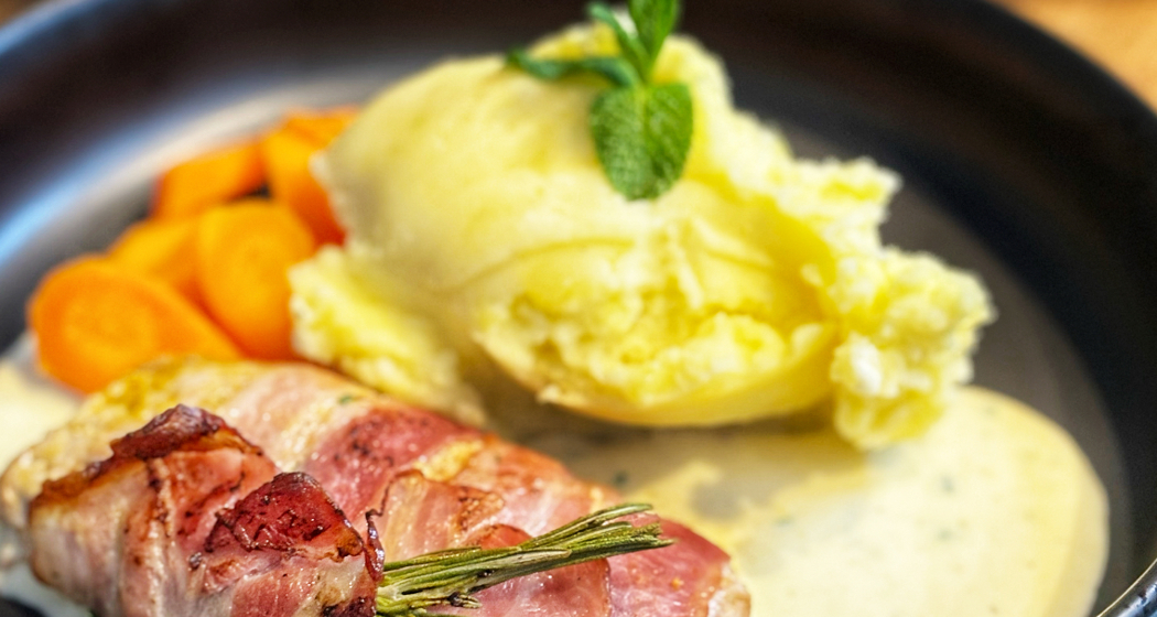 Fleisch würzen, mit Rosmarin und Speck umwickeln, für 12 Minuten im Backofen bei 180 Grad