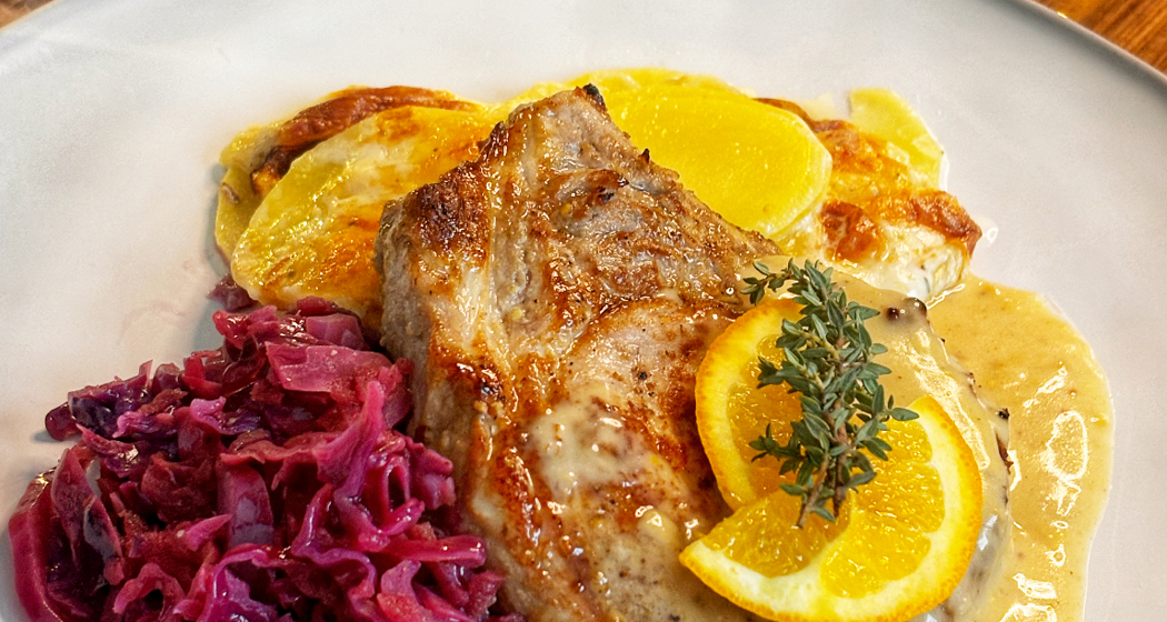 Butter und Öl in einer Pfanne erhitzen und die Koteletts darin auf jeder Seite ca. 4-5 Minuten anbraten, bis sie goldbraun und durchgegart sind. Aus der Pfanne nehmen und warmhalten. Im Bratensatz den Orangensaft, Honig und Senf einrühren und kurz aufkochen. Rahm hinzugeben und die Sauce auf die gewünschte Konsistenz einkochen lassen.