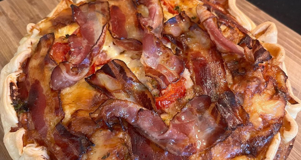 Bei der letzten Schicht die Speck Trachen verteilen und den Rand vom Teig einklappen.