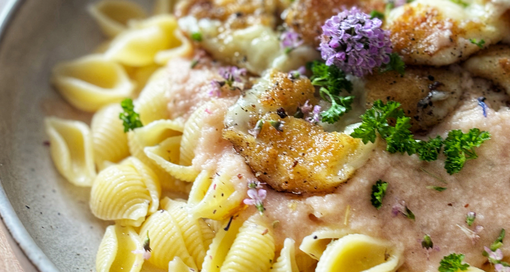 Pasta im Salzwasser gar kochen.Den Blumenkohl im Salzwasser ca. 10-15 Minuten kochen. Zwiebel, Knoblauch und Blumenkohl zusammen mit den Kichererbsen pürieren. Immer wieder bisschen Salzwasser hinzufügen bis eine cremige Sauce entsteht. Tomatensugo hinzufügen und mit Salz&Pfeffer abschmecken. Sauce über die Pasta geben und die Kugeln darauf verteilen.