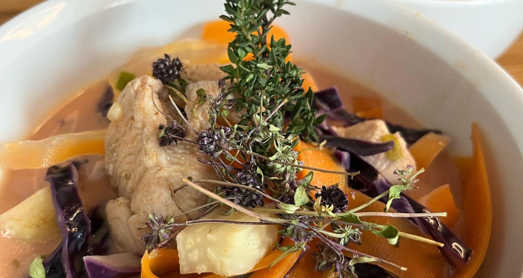 Gemüse schälen und klein schneiden. Pouletbrust in kleine Stücke schneiden, würzen, mit etwas Butter in der Bratpfanne scharf anbraten. Fleisch,Reis und Gemüse in einen Topf geben mit Bouillon auffüllen und kochen bis das Gemüse gar ist. Orange halbieren und den Saft ausdrücken und mit dem Tomatenmark unter das Gemüse heben. Kurz vor dem Servieren den Rahm dazugeben und noch etwas abschmecken.