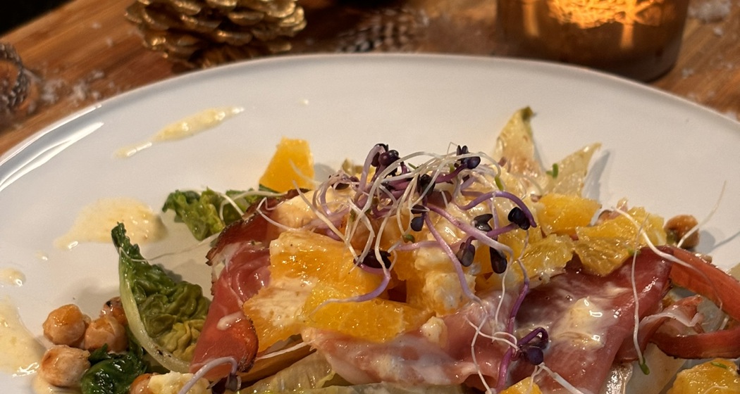 Dieser Wintersalat kombiniert süsse Orangen, würzigen Schinken, knackige Sprossen und geröstete Kichererbsen, perfekt als festliche Vorspeise oder leichter