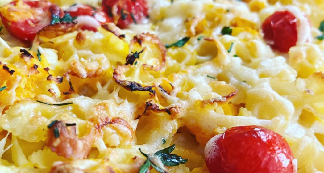 Teigwaren al dente im Salzwasser kochen. Kürbis schälen, entkernen und raffeln. Zwiebel und Knoblauch schälen und klein schneiden. Käse raffeln und Tomaten halbieren. Milch und Rahm verrühren den Käse dazu und würzen. Teigwaren in eine Gratinform geben mit dem Kürbis und Tomaten untereinander mischen, die Milchmaße über die Teigwaren gießen etwas Petersilie und Schnittlauch darüber streuen.