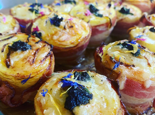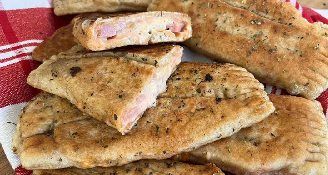Den Teig rechteckig ausrollen, schön dünn. 8 Rechtecke ausschneiden, etwas von der Füllung mittig verstreichen und zuklappen (siehe Bild), mit der Gabel die Enden zudrücken. In einer Bratpfanne etwas Butter erhitzen und die Brötchen schön goldgelb anbraten mit etwas Pizzagewürz bestreuen und servieren.
