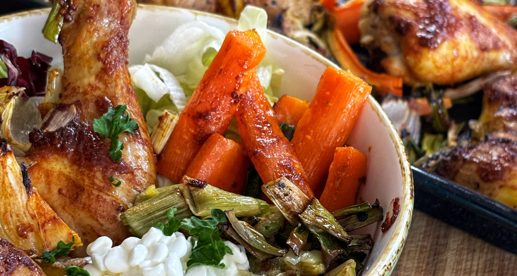 Für die Bowl noch den Salat schneiden, in eine Schüssel geben. Die Saucenzutaten miteinander vermischen und darüber geben. Die Zutaten vom Blech anrichten und bisschen Hüttenkäse dazu.