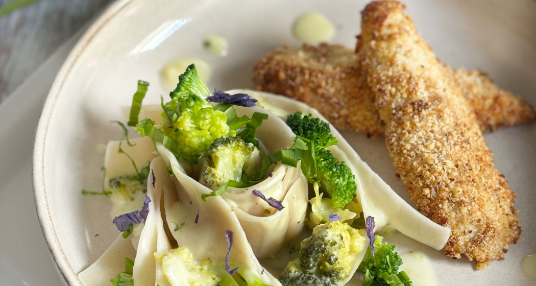 Reibkäse, Paniermehl, Salz&Pfeffer auf einem Teller vermengen. Rohes Ei mit Senf und Honig verrühren. Filets erst im Ei dann in der Käse-Brotmischung wenden. Auf ein mit Backpapier belegtem Backblech legen und im Backofen Ober-/ Unterhitze bei 180 Grad, 18 Minuten backen. Brokkoli in Scheiben schneiden. Etwas Butter in einer Pfanne zum schmelzen bringen, Frischkäse dazugeben verrühren und das Mehl dazugeben, mit Bouillon ablöschen. Brokkoli hinzufügen und bei kleiner Hitze köcheln bis der Brokkoli gar ist. Bandnudeln nach Angaben des Herstellers im Salzwasser kochen. Statt Brokkoli könnt ihr auch Karotten, Cherrytomaten oder grüne Spargeln verwenden schmeckt auch super.