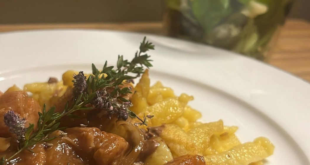 Fleisch mit Salz&Pfeffer, Cayennepfeffer würzen, im Mehl wenden. Zwiebel, Knoblauch und Karotten schälen und klein schneiden. In einer Bratpfanne etwas Butter schmelzen lassen und das Fleisch mit Zwiebeln, Knoblauch und Karotten scharf anbraten, mit Wein und Bouillon ablöschen, Tomatenmark dazugeben. Alles in einen Römertopf geben.