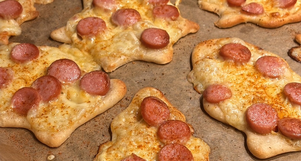 Pizzateig ausrollen mit einer Form das gewünschte Motiv ausstechen, auf ein mit Backpapier belegtes Backblech legen, den Pizzaboden paar mal mit einer Gabel einstechen.