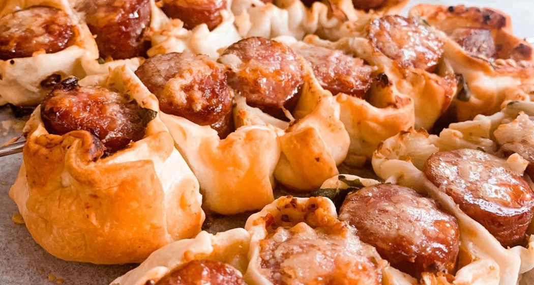 Den Blätterteig in der Länge und der Höhe halbieren so das vier gleich grosse Rechteck entstehen. Die Rauchwurst (nicht gekocht) in den Blätterteig einrollen und aus der Wurst 6 gleich grosse „Rädli“ schneiden und mit einem Spiess aufspiessen, etwas Reibkäse darüber streuen und alles für 30 Minuten bei