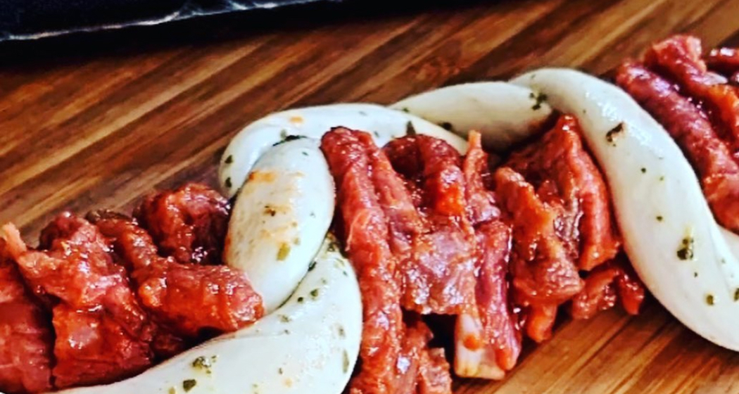Den Teig in 4 Teile schneiden und in Stränge formen mit etwas Pesto bestreichen in die Mitte halbieren und zwirbeln mit dem Spiess aufspießen,mit paar Stücken Fleisch folgen dann das Fleisch umwickeln und wieder Fleisch so abwechselnd bis der Teig aufgebraucht ist.