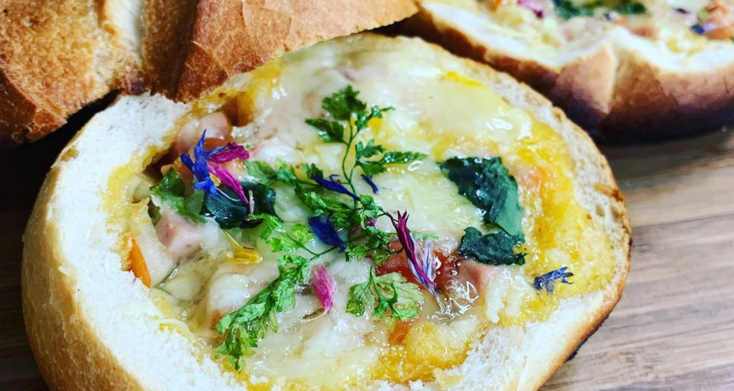 Zwiebel schälen und mit dem Wienerli, Tomate klein schneiden alles in eine Schüssel geben und mit 3 Eier untermischen . Abschmecken mit Salz&Pfeffer und die Masse in die Aushöhlung füllen. Den Käse darüber streuen ich habe noch ein wenig Basilikum, Kerbel und bunte Blüten zur Deko hinzugefügt. Alles für 12 Minuten auf den Grill bei ca 160 Grad.