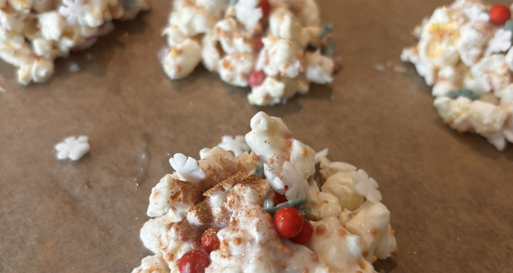 Die geschmolzene Glasur über das Popcorn giessen und alles vorsichtig vermengen, sodass das Popcorn gleichmässig überzogen ist. Mit einem Löffel kleine Häufchen auf ein Backpapier legen. Nach Wunsch mit Zuckerstreuseln dekorieren und die Glasur vollständig fest werden lassen.