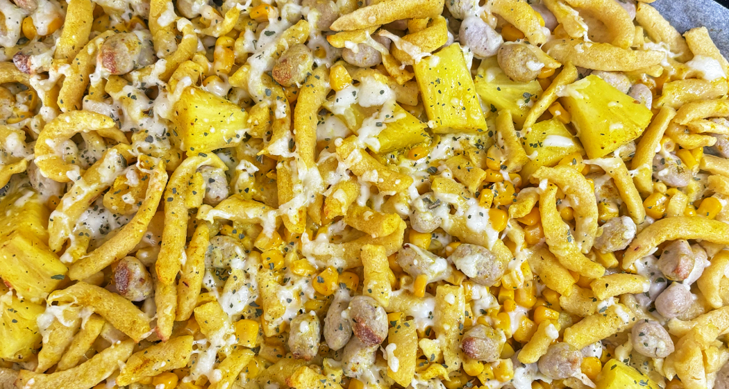 Wenn du Ananas und Curry nicht magst, dann nehme Tomaten und Basilikum statt Kiri Mozzarella und ja das höre ich auch oft alles zusammengemischt essen sie nicht, dann mach eine Seite Spätzli, eine Seit Chögali, eine seit Ananas usw.…