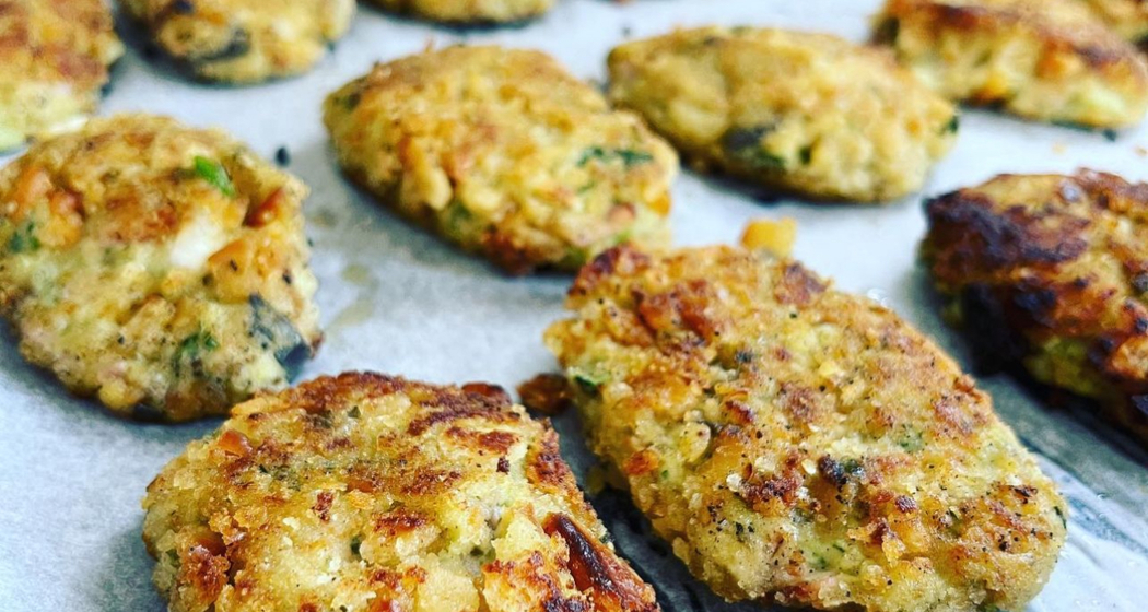 Die Hände etwas feucht machen und von der Masse kleine Nuggets formen in den Tuc‘s-Krümel wenden und kurz in einer Bratpfanne mit etwas Rapsöl anbraten dann auf ein mit Backpapier belegtes Blech legen und für