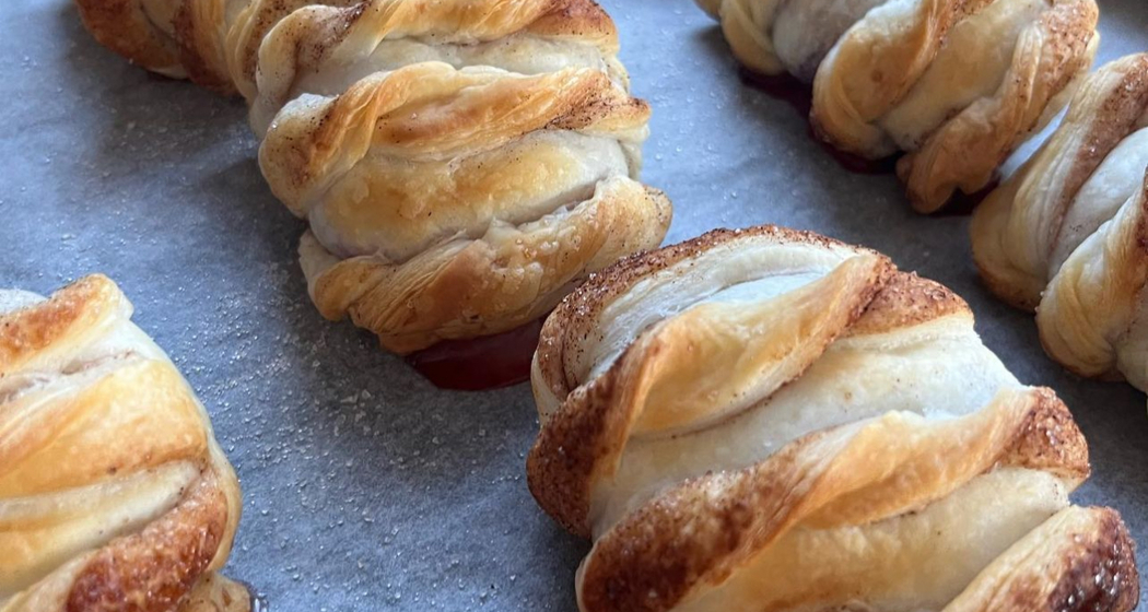 Blätterteig in 5 Bahnen schneiden und halbieren, mit Zucker und Zimt bestreuen.